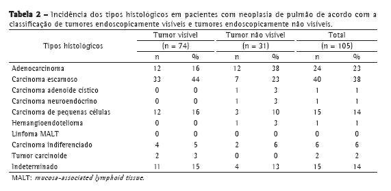 Foram comparados os tipos histológicos com o grupo de tumor endoscopicamente visível e, catalogando-se apenas os exames que faziam parte exclusivamente desse grupo, a despeito da presença de achados de lesão na mucosa ou de secreção endobrônquica, foi avaliado um total de 74 pacientes. Desses, foram mais prevalentes carcinoma escamoso, em 45%; adenocarcinoma, em 16%; e carcinoma de pequenas células, em 16% (Tabela 2).