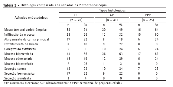 Dos casos de carcinoma escamoso, 58 pacientes (74%) apresentaram como achado endoscópico massa tumoral endobrônquica; 28 pacientes (36%), com infiltração da mucosa; 8 (10%), com estreitamento do lúmen; e 5 (6%), com compressão extrínseca (Tabela 3). Dos 41 pacientes diagnosticados com adenocarcinoma, 20 (49%) apresentaram massa tumoral endobrônquica; 13 (32%), com infiltração da mucosa; 9 (22%), com estreitamento do lúmen; e 10 (24%), com compressão extrínseca. Dos 25 pacientes diagnosticados com carcinoma de pequenas células, 16 (64%) apresentaram massa tumoral endobrônquica; 15 (60%), com infiltração da mucosa; nenhum (0%), com estreitamento do lúmen; e 6 (24%), com compressão extrínseca (Tabela 3).