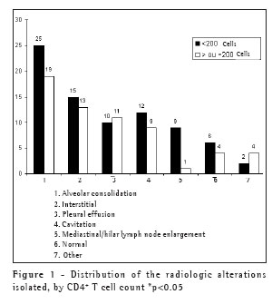 After evaluating the radiologic alterations isolated, we observed that the alveolar consolidation pattern predominated, followed by the interstitial pattern. Cavitations were found in the same number of cases in which pleural effusion was described. The distribution of the radiologic alterations by CD4+ T cell counts, using 200 cells/mm3 as a cutoff point, is demonstrated in Figure 1. The mean CD4+ T cell counts for each radiologic pattern are presented in Figure 2.