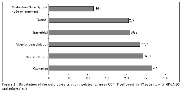 DISCUSSIONWhen accompanied by HIV, thoracic TB can present various radiologic patterns. No statistically significant differences were found when the radiologic alterations were compared with the degree of immunosuppression, except in regard to the mediastinal/hilar lymph node enlargement, which was significantly prevalent in patients with severe immunosuppression.