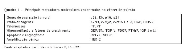 Apesar de novas terapias, a sobrevida no CP permanece baixa. Marcadores moleculares podem representar uma importante ferramenta na compreensão da carcinogênese pulmonar, no diagnóstico precoce, na determinação do prognóstico e na identificação de novos tratamentos para pacientes com CP.(59) Como a grande maioria dessas anormalidades no CP está relacionada ao tabagismo, torna-se importante enfatizar a necessidade de prevenção deste fator, principalmente em pacientes de risco elevado (grandes tabagistas).