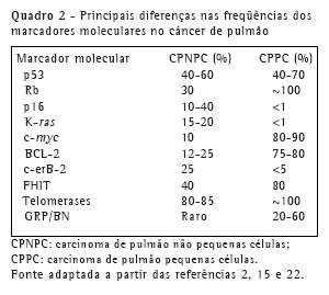A primeira comprovação dos genes de supressão tumoral foi a identificação do gene retinoblastoma (Rb), sendo que defeitos no Rb são quase universais no CPPC, mas observados em somente 30% dos CPNPC.(35) O gene Rb, localizado no braço longo do cromossomo 13 (13q), codifica uma fosfoproteína nuclear reguladora da divisão celular. O papel da expressão alterada do Rb e do p53 foi estudado no CPNPC.(35)