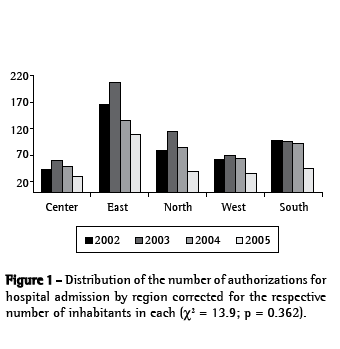 Figure 1 shows the number of hospital admissions in each region, in the four years studied, corrected for the respective number of inhabitants in each one of them. We can see that there was a reduction in the number of asthma-related hospital admissions in all regions of the city in 2005.