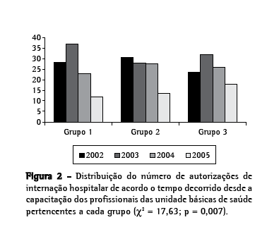 Quando se relaciona a redução do número de internações ao tempo decorrido desde a capacitação dos profissionais das USF pertencentes a cada grupo, verifica-se o declínio mais acentuado naquelas em que a capacitação ocorreu há mais tempo. A Figura 2 mostra o número de internações, nos quatro anos, de acordo com o tempo decorrido desde a capacitação dos profissionais das USF pertencentes a cada grupo.