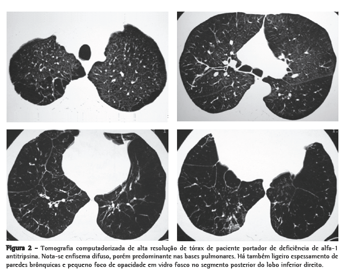 superiores. A tomografia de alta resolução evidenciava opacidades em vidro fosco, consolidações e nódulos do espaço aéreo. Nova tomografia