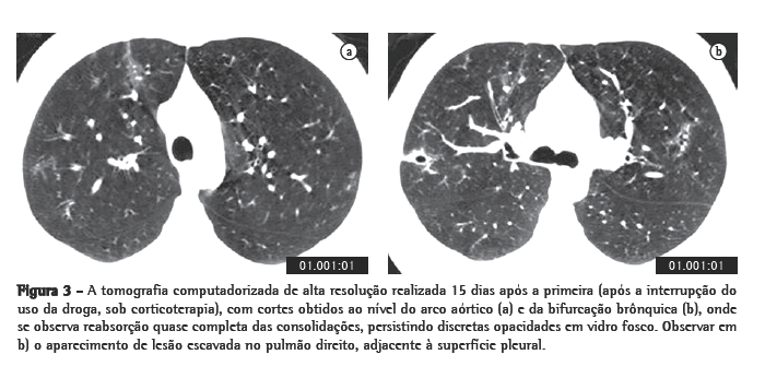 A TCAR de controle, feita 15 dias após o primeiro exame (Figura 3), evidenciou grande melhora radiológica, com persistência de algumas opacidades em vidro fosco esparsas, e aparecimento de algumas escavações onde antes existiam consolidações.
