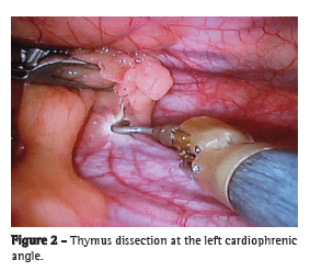 We could safely visualize and dissect the upper lobes of the thymus, with a radical and complete resection, including all of the fat from the pericardium down to the diaphragm. We opted for a left-side approach, because it allows easier access to the aortopulmonary window, which is a common location of ectopic thymic tissue.(6) In addition, a left-side approach makes it easier to identify the phrenic nerve, which is mandatory in this population of patients.