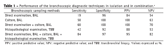 Direct examination and culture of BAL specimens used in combination with TBB increased the sensitivity and NPV of bronchoscopy to 84% and 82%, respectively. The specificity and PPV obtained by combining the three methods of analysis (direct examination of BAL specimens, BAL culture, and histopathological examination of TBB specimens) were 97% and 95%, respectively (Table 1).