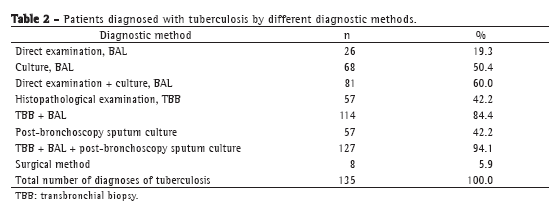 In our study, we did not compare the bronchoscopy results with those of induced sputum with hypertonic saline. Previous studies have shown that the use of induced sputum is valid because it is inexpensive, has a good diagnostic yield, and has a low risk of complications; however, other studies have shown that induced sputum results are similar to those of bronchoscopy in the final diagnosis of tuberculosis.(16-20) In our study, we considered only the analysis of sputum collected immediately after bronchoscopy, cases in which the manipulation and hydration of the bronchial mucosa during the collection of BAL specimens stimulate cough and expectoration, facilitating the collection of respiratory secretion samples. We showed that there was a significant increase in the diagnostic sensitivity.