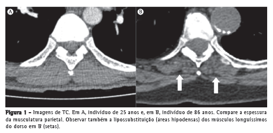 Alterações radiológicas relacionadas ao envelhecimento da caixa torácicaUm dos achados radiológicos mais comuns na parede torácica é a redução da espessura dos músculos parietais, que é bem demonstrada por TC, especialmente quando comparada com aquela de indivíduos mais jovens (Figura 1). Essa redução é uma das principais causas do aumento da transparência pulmonar em estudos radiográficos de tórax em idosos. Apesar de não haver estudos definindo a idade inicial para o encontro desse achado, sabe-se que isso decorre da perda de massa muscular associada ao processo fisiológico de envelhecimento, sendo mais evidente quanto maior for a idade do indivíduo.(4-10) Entretanto, não existem ainda critérios objetivos que permitam diagnosticar esse achado pelos métodos de imagem. Outro achado de ocorrência comum é a presença de calcificações da cartilagem costal, que se apresentam como pequenas ilhas de matéria óssea compacta e que podem ter aparência nodular, sendo confundidas, em alguns casos, com nódulos pulmonares solitários.(3)