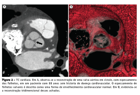 Tratando-se de características radiológicas, as principais alterações do "coração do idoso" são o aumento da massa muscular e da espessura do miocárdio, especialmente do ventrículo esquerdo, devido à hipertrofia dos miócitos e ao aumento da matriz de tecido conjuntivo (Figura 2); espessamento marginal das valvas cardíacas (frequentemente a mitral e a aórtica) devido a depósitos de gordura, colágeno e sais de cálcio, provocando desgaste do anel valvar e consequente insuficiência leve em aproximadamente 90% dos pacientes saudáveis com idade superior a 80 anos; e esclerose coronariana, tendo como consequência possíveis alterações da perfusão miocárdica.(16,17,20-23) Embora essas modificações, em sua grande maioria, não tenham repercussão clínica em pacientes hígidos, essas podem facilitar a descompensação em um momento de sobrecarga por um fator externo, como, por exemplo, processos infecciosos.