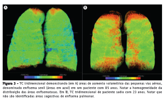 Estudos morfométricos têm mostrado um aumento progressivo da distância média entre as paredes dos espaços aéreos e uma diminuição da superfície das paredes do espaço aéreo, por unidade de volume pulmonar.(34,39,40) Essas alterações têm início na terceira década de vida e progridem de forma linear e contínua, resultando em uma diminuição da superfície das paredes do espaço aéreo de 25-30% em nonagenários.(39,40) Embora essas mudanças sejam histologicamente diferentes daquelas do enfisema pulmonar, no qual há a destruição das paredes alveolares, elas resultam em mudanças semelhantes na complacência pulmonar. Da mesma forma que o enfisema pulmonar, essas alterações ocasionam uma redução dos tecidos de suporte em torno das vias aéreas, onde há uma tendência ao colapso das pequenas vias aéreas (< 2 mm) e consequente alteração no fluxo aéreo. Tal fenômeno de alterações morfoestruturais no parênquima pulmonar associado ao envelhecimento tem sido denominado na literatura como "enfisema senil" (Figura 3).(38)