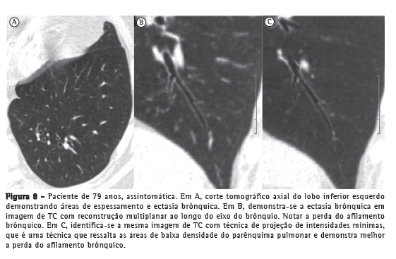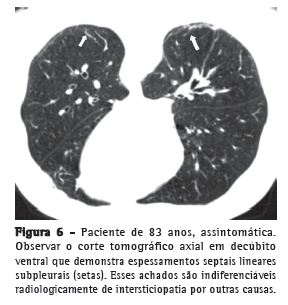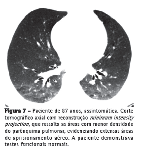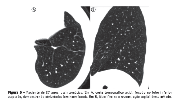 No estudo por TC do parênquima pulmonar, identificam-se alguns achados radiológicos muito comuns em idosos, e especula-se que eles tenham relação com as alterações do colágeno. Esses achados são atelectasias laminares, na maioria das vezes posteriores e basais, localizadas em áreas pendentes dos pulmões (Figura 5); espessamentos lineares subpleurais (Figura 6); áreas de aprisionamento aéreo (Figura 7); espessamento e ectasia brônquica (Figura 8); e cistos pulmonares.(41,50-53)