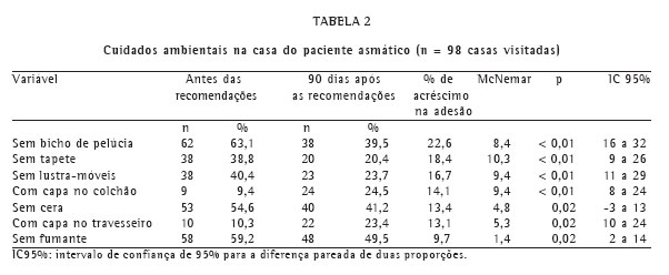 A Tabela 2 mostra a comparação da taxa de adesão antes e após a distribuição das recomendações sobre cuidados ambientais. Pode-se verificar que em muitas residências já havia, intencionalmente ou não, algum tipo de controle ambiental em níveis até razoáveis, como, por exemplo, a ausência de tapetes, em 60 delas (61,2%).