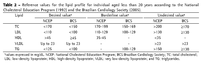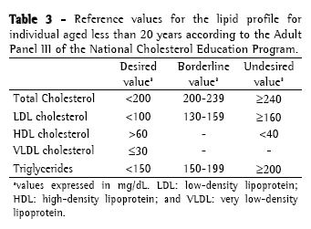 There is no specific recommendation for screening and laboratory testing diagnosis of CFD. Therefore, the orientations and reference values are extrapolated from the guidelines of the National Cholesterol Education Program, 1992(36) and from the Brazilian Cardiology Society, 2005(37) for children (Table 2); and from the recommendations of the Adult Panel III of the National Cholesterol Education Program(38) (Table 3) for adults. The reference values suggested by the Brazilian Cardiology Society for individuals aged less than 19 years differ from those of the National Cholesterol Education Program, since it proposes lower values of CT, LDL and TG.