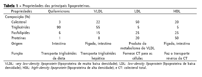 As lipoproteínas são classificadas conforme sua mobilidade eletroforética e densidade (quanto maior a quantidade de apoproteínas, maior a densidade; e quanto maior a quantidade de TG, menor a densidade).(9) As principais lipoproteínas são: quilomícrons (QM), very low-density lipoprotein (VLDL; lipoproteína de densidade muito baixa), lipoproteínas de densidade intermediária, low-density lipoprotein (LDL; lipoproteínas de baixa densidade) e high-density lipoprotein (HDL; lipoproteínas de alta densidade). A Tabela 1 mostra as propriedades das principais lipoproteínas.