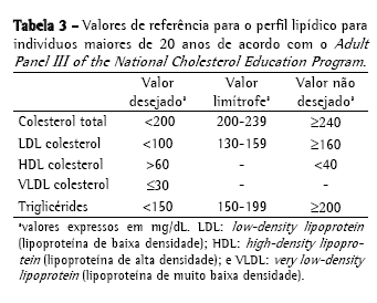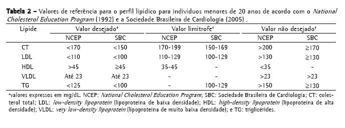 Abordagem da dislipidemia relacionada à fibrose císticaTriagem e diagnósticoNão existe uma recomendação especifica para triagem e diagnóstico laboratorial da DFC. Por isto, as orientações e valores de referência são extrapolados das diretrizes da National Cholesterol Education Program, de 1992(36) e da Sociedade Brasileira de Cardiologia, de 2005(37) para crianças (Tabela 2); e das recomendações do Adult Panel III of the National Cholesterol Education Program(38) (Tabela 3) para adultos. Os valores de referência sugeridos pela Sociedade Brasileira de Cardiologia para indivíduos menores de 19 anos diferem daqueles da National Cholesterol Education Program, uma vez que propõem valores inferiores de CT, LDL e TG.