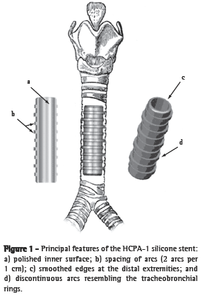 There were no technical difficulties encountered during the use of the HCPA-1 silicone stent. The external arcs successfully increased adherence at the implantation site. We believe that the proposed stent model would be ideal for applications involving the trachea and proximal bronchi. The mechanical assays were appropriate for determining the properties of silicone prototypes of various densities. These assays can be easily reproduced using the present methodology to evaluate various diameters, degrees of rigidity or radial strength for a broad range of applications.
