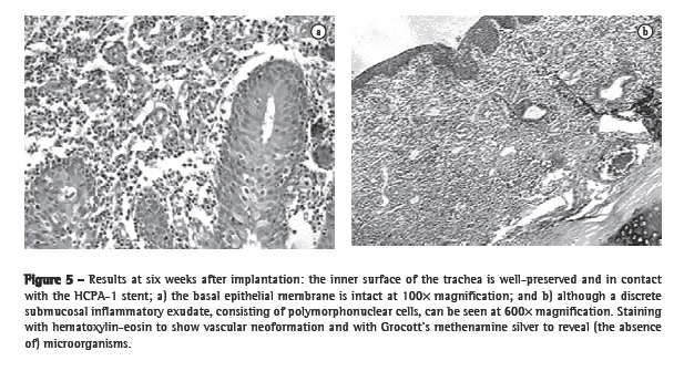 There were no remarkable postimplantation events or complications, and there were no cases in which the need to remove a stent arose. At eight weeks after implantation, the devices were found to be well-positioned (Figures 3 and 4). Histopathologic analysis of the tracheal specimens showed a well-preserved epithelial basal membrane. As shown in Figure 5, a small quantity of submucosal inflammatory infiltrate, consisting predominantly of polymorphonuclear cells, was frequently observed, together with sparse areas of granulation tissue and vascular neoformation. No microorganisms were detected.