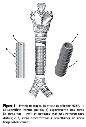 A órtese de silicone aqui descrita foi denominada órtese HCPA-1 e é uma versão modificada do modelo Dumon.(10) As melhorias pretendidas são as seguintes: uma superfície externa recoberta por arcos descontínuos salientes semelhantes aos anéis traqueobrônquicos (para inserção e fixação no lúmen das vias aéreas inferiores); uma superfície interna altamente polida que impede a adesão de muco espesso, sangue ou outros materiais da árvore respiratória; extremidades lisas para diminuir danos causados pela fricção e efeito do golpe de aríete, que pode decorrer do impacto do movimento da órtese durante a respiração e tosse (Figura 1).