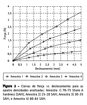 A pressão requerida para o deslocamento foi calculada para cada densidade, considerando-se uma área de contato de 1 cm2: 70-75 SAH, 2,4 N/cm2; 25-28 SAH, 0,5 N/cm2; 30-35 SAH, 1,1 N/cm2; e 60-64 SAH, 1,75 N/cm2 (Figura 2).