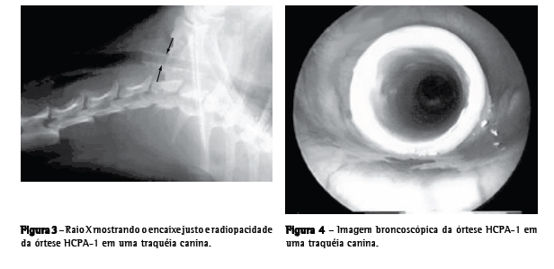 Os animais foram avaliados a cada duas semanas, com revisões broncoscópicas e radiográficas para a avaliação do posicionamento da órtese. Após oito semanas, os animais sofreram eutanásia sob anestesia geral, mediante infusão de sulfato de manganês endovenoso na dose de 1 mL/kg PC.