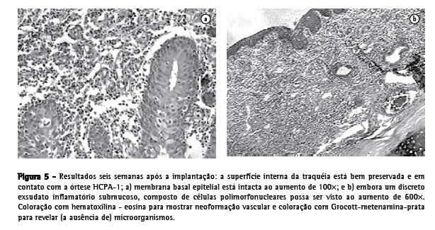 Não houve eventos ou complicações marcantes após a implantação, e não surgiram casos nos quais precisássemos remover uma órtese. Após oito semanas da implantação, os dispositivos estavam bem posicionados (Figuras 3 e 4). A análise histopatológica dos espécimes traqueais revelou uma membrana basal epitelial bem preservada. Como se vê na Figura 5, uma pequena quantidade de infiltrado inflamatório submucoso, consistindo predominantemente de células polimorfonucleares, foi observada com freqüência, juntamente com áreas esparsas de tecido de granulação e neoformação vascular. Não foram detectados microorganismos.