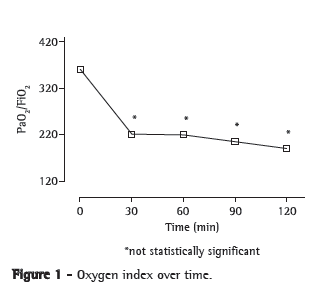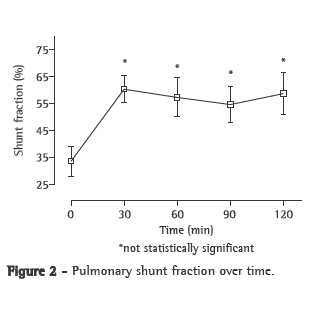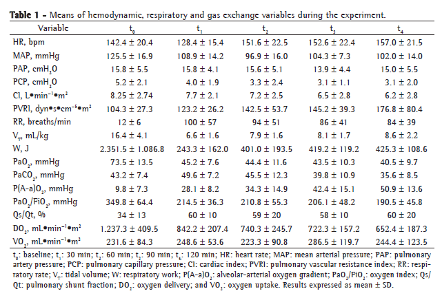 DiscussionFor decades, intravenous OA has been administered in order to mimic pulmonary embolism in animal models,(4) and, since the 1970s, it has been administered in models of ALI.(5) One group of authors(17) conducted a study involving 22 dogs, who were kept alive for seven days in order to evaluate the various stages of the pathophysiology of ALI. That study revealed that Qs/Qt and P(A-a)O2 returned to values close to baseline values by the end of the experiment. There was significant worsening of these variables on day 1 and subsequent improvement until day 7. A more recent study(18) revealed the resolution of the edema on day 7 after infusion of OA. Another group of authors(11) showed the evolution of respiratory, hemodynamic and gas exchange variables but did not assess the stability of the model. Those authors studied 8 dogs for 2.5 h and compared the variables using ANOVA with repeated measures. There was an indefinite increase in PAP and PVRI. The increase in pulmonary compliance, PVRI and P(A-a)O2 was designated as a recent event, as was the decrease in PaO2, CI and MAP. The increase in PAP, Qs/Qt and PaCO2 was treated as a late event. A study involving pigs(12) revealed stability of the model at 30 min for HR, PAP, Qs/Qt and dead space. In that study, ANOVA with repeated measures was also used in order to study the variables. In our study, MAP stabilized at t1, whereas HR, PAP and PCP showed a tendency toward stabilization at t2. Another group of authors(19) observed that those variables did not change during their study, which ensured the hemodynamic stability necessary for a model of ALI. The decrease and subsequent stabilization of the CI and gas exchange, as well as the increase in PVRI, are biologically plausible and accepted in the literature. It is likely that the decrease in myocardial contractility and the vascular lesion that are revealed by simple histological examination, despite there being no change in the wet-to-dry weight ratio, are responsible for the initial decrease in Qt.(20) Another important factor for the decrease in the CI is the vasoplegia that occurs in this model. In our study, we observed a decrease in the CI using thermodilution and an increase in PVRI without stabilization-results that are discordant with those found in the literature. Other authors(21) demonstrated that, in rabbit lungs, it is not the total PVRI that changes but rather the segmental distribution of resistances. It is likely that our methodology was the reason for the discrepancies between our results and those of other authors, and that, if there is hemodynamic stabilization, it will occur after the stabilization of respiratory and gas exchange properties. In our study, it was clear that the increase in MV was due to the significant increase in RR, since VT decreased. This determined the decrease in PaCO2 and the nonstabilization of pH. We were unable to measure respiratory system compliance or resistance due to the high RRs observed. However, W decreased in each respiratory effort due to the significant decrease in VT, although W/min increased throughout the experiment, suggesting a constant increase in compliance or airflow resistance and, therefore, in pulmonary impedance. When OA is administered, pulmonary compliance can increase up to three times in relation to its baseline value.(22) It is also known that there is an increase in airway resistance, measured by using various methods, due to the accumulation of secretion.(23) One group of authors(24) measured the wet-to-dry weight ratio in pigs and observed that this ratio increased significantly in the group that received OA, compared with the control group, which suggests worsening of compliance. Using forced oscillation, the authors of another study(25) demonstrated an increase in airway opening pressure, although without stabilization for up to 140 min. The principal events responsible for the increase in compliance are the accumulation of liquid in the alveolar and interstitial space and the increase in surface tension. Since Qs/Qt seems to correlate with the severity of the lesion, the extravasation of intra-alveolar fluid tends to decrease during the experiment. With a 0.09 mL/kg dose of OA, shunt values are higher than 40%.(26) Using 0.08 mL/kg, other authors(12) registered shunt values of up to 35%. Those authors also demonstrated the decrease in and the stabilization of PaO2 in the first 30 min, this condition persisting for 4 h. Another group of authors(27) found lower, basal fractions of Qs/Qt than those found in our study, approximately 15-20%. The dose used in the present study (0.15 mL/kg) explains the high Qs/Qt levels found. The 0.08 mL/kg dose of OA reduced the PaO2/FiO2 ratio from 451 to 139.(8)