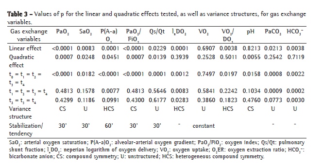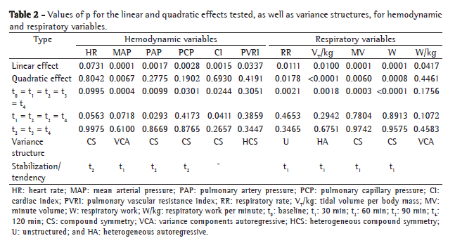 Statistical methodsThe results were presented as mean ± SD. The null hypothesis was that the means of hemodynamic, respiratory and gas exchange variables were similar at t0, t1, t2, t3 and t4. The possibility that the means of the variables at t0 were different from those at the other time points and that the latter were similar to one another was the most plausible, which would signify stability after t1 or t2. The methodology used had a repeated measure design. In order to determine whether a polynomial, a linear or a quadratic function reasonably fit the data, an analysis of linear or quadratic tendency was performed. As a result, if the data fit only the linear effect, the mean of the variable would increase or decrease over time, and there would therefore be no stabilization. If solely the quadratic effect fit the data, the mean of the variable would increase or decrease up to a certain time point and would subsequently decrease or increase from that point onward.