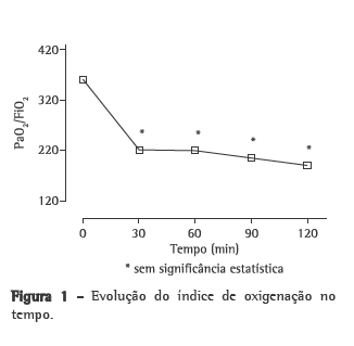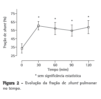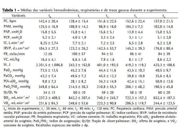Notou-se um indefinido aumento da PAP e IRVP. Denominaram como eventos recentes o aumento da elastância pulmonar, IRVP e P(A-a)O2, assim como a diminuição de PaO2, IC e PAM. Consideraram o aumento de PAP, Qs/Qt e PaCO2 como eventos tardios. Alguns autores(12) publicaram um estudo em porcos, demonstrando estabilidade do modelo em 30 min para FC, PAP, Qs/Qt e espaço morto. Esses autores também utilizaram a análise de variância com medidas repetidas para estudar suas variáveis. Em nosso estudo, observamos a estabilização da PAM aos 30 min e a tendência de estabilização de FC, PAP e PCP aos 60 min.
