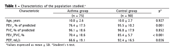 ResultsWe evaluated 217 children and adolescents; of those, 165 were included in the study: 75 patients with asthma and 90 controls (Figure 1). There were 41 males (54%) in the asthma group and 43 males (47%) in the control group. Table 1 shows some characteristics of the population studied.