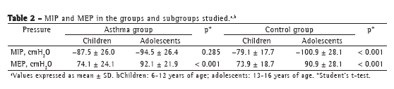 The objective of the present study was to compare children/adolescents with mild or moderate asthma and healthy controls in terms of respiratory muscle strength-as determined by measuring maximal respiratory pressures-and correlate MIP and MEP with spirometric variables in the former group.
