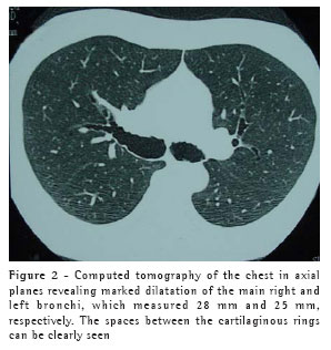 Mounier-Kuhn syndrome is occasionally found in asymptomatic individuals. When symptomatic, it is characterized by recurrent pneumonia, sometimes evolving to chronic productive cough, occasional hemoptysis, and progressive dyspnea as a result of the pulmonary involvement. More rarely, massive hemoptysis,(4) spontaneous pneumothorax, and digital clubbing can be observed. We believe that, in the case in question, the syndrome was responsible for the inappropriate response to the appropriate antibiotic therapy, which led us to suspect of a structural abnormality of the airways.