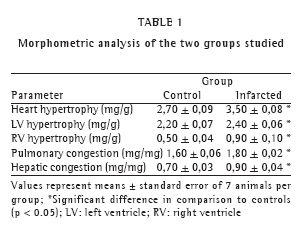 A study using a similar technique to induce infarction found decreased systolic pressure in the left ventricle and a lower cardiac index, data that corroborate our findings.(21) Therefore, the development of heart hypertrophy, as well as of pulmonary and hepatic congestion, may result from a change in the cardiac mechanics and from a lower cardiac index.