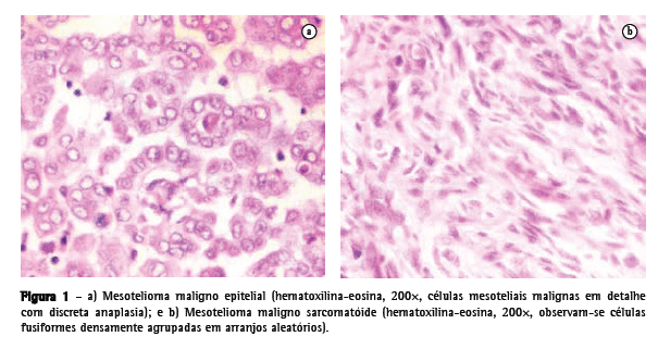 Do ponto de vista anátomo-patológico, o MPM é classificado em 3 subtipos: epitelial, sarcomatóide e bifásico (ou misto). O epitelial ocorre em 50 a 60% dos casos e se caracteriza por melhor prognóstico clínico. Sua diferenciação com o adenocarcinoma metastático pode ser difícil, justificando a necessidade de maiores fragmentos de tecido. O tipo sarcomatóide compreende 15% dos casos, sendo composto por células fusiformes e assemelhando-se ao fibrossarcoma ou ao leiomiossarcoma. O mesotelioma bifásico é representado pela associação de áreas epiteliais e sarcomatóides, sendo necessárias múltiplas secções para demonstrar ambos os componentes(2) (Figura 1). A avaliação imunohistoquímica dos fragmentos complementa a análise histológica e é ferramenta essencial para o diagnóstico definitivo, sendo os marcadores mais úteis a calretinina (diagnóstico de mesotelioma) e o antígeno carcinoembrionário (diagnóstico de adenocarcinoma).