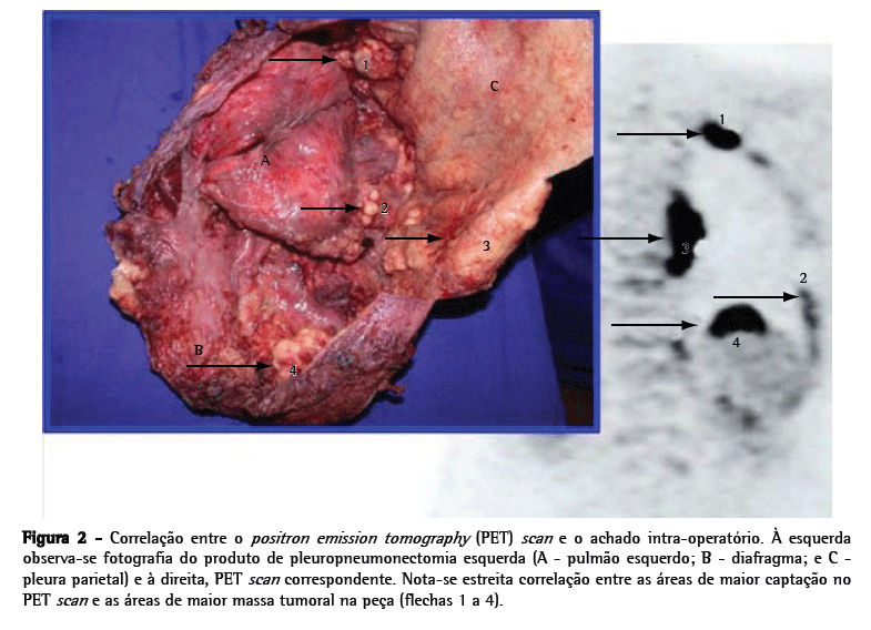 De acordo com um consenso publicado recentemente,(13) o estadiamento mínimo para o paciente que vai ser submetido a tratamento multimodal é a tomografia computadorizada helicoidal de tórax com contraste e o PET scan para adequado estadiamento local e exclusão de eventuais metástases ocultas. A tomografia de crânio ou ressonância do encéfalo é sugerida apenas nos casos com suspeita clínica de metástases.(13) Quanto a laparoscopia, mediastinoscopia e toracoscopia contralateral, não há consenso, e os procedimentos são realizados conforme a rotina dos serviços. Nos casos estudados neste trabalho, todos foram submetidos à tomografia de tórax para estadiamento. Os pacientes candidatos a tratamento multimodal, conforme sugere a literatura, foram submetidos ao PET scan e, em um desses casos, foi identificada metástase silenciosa em linfonodo da cadeia mesentérica superior. A laparoscopia foi realizada em um caso no qual havia suspeita de disseminação peritoneal. Portanto, uma avaliação clínica adequada e um estadiamento completo da doença são essenciais para a decisão terapêutica. Uma observação interessante em nosso estudo foi a estreita correlação entre as áreas de maior captação no PET scan e as áreas mais comprometidas do achado intraoperatório (Figura 2).