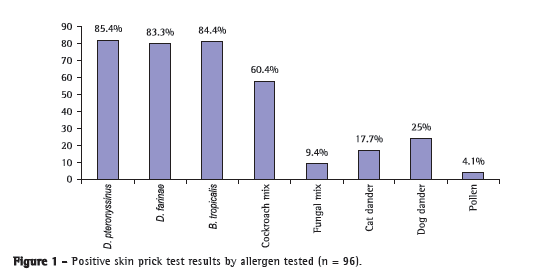 With regard to the skin prick test, there was a predominance of positive responses to house dust mites (> 80%), principally D. pteronyssinus (85.4%). The frequency of positive responses to each allergen tested is shown in Figure 1. On the basis of the atopic index, 37 individuals (38.5%) were classified as belonging to the group of patients with little or no response to the skin prick test (a group comprising those without atopy and those with a positive response to 3 or fewer allergens, i.e., < 4), whereas 59 (61.5%) were classified as belonging to the group with a strong response (a group comprising those with a positive response to 4 or more allergens, i.e., ≥ 4).