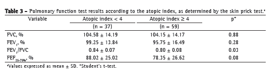 We analyzed pulmonary function parameters (FVC, FEV1, FEV1/FVC ratio, and FEF25-75%) and the data collected with the ISAAC questionnaire. The presence of atopy was analyzed after standardization by means of a quantitative method, based on the number of positive responses to the allergens tested.