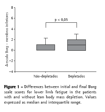 Therefore, we raised the hypothesis that COPD patients with LBM depletion present more significant alterations in cardiopulmonary variables after the 6MWT than do patients without LBM depletion. The objective of the present study was to analyze heart rate, respiratory rate, oxygen saturation (determined using pulse oxymetry) and Borg scale scores (for dyspnea and lower limb fatigue) in COPD patients with and without LBM depletion, prior to and after the 6MWT.
