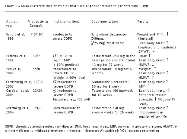 The correlation between reduction of muscle mass and mortality in patients with COPD(6) could justify the use of steroids in this population, since supplementation with these substances has been found to be efficient in increasing body weight and muscle mass.(14-19) However, before initiating this therapy, we have to ensure that there is no prostatic neoplasm or significant liver disease since both processes can be accelerated by the supplementation.