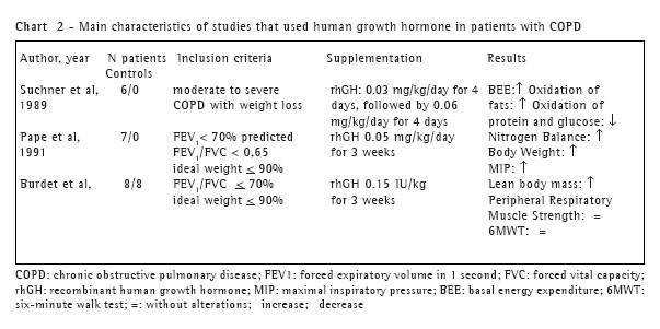 Other authors(40) analyzed the effects of rhGH supplementation (0.05 mg/kg/day of subcutaneous administration for 3 weeks) in 7 patients with COPD (FEV1 < 70% of predicted) and low body weight (< 90% of ideal weight).(41) There was significant weight gain and improved nitrogen balance. In functional terms, respiratory muscle strength, evaluated by maximal inspiratory pressure, increased by an average of 33% in 6 patients and decreased by 8% in 1. There were no changes in respiratory muscle endurance.