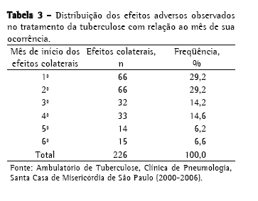 Sabe-se que a maioria das reações ocorrem nos primeiros três meses de tratamento.(6) Em um estudo com 511 pacientes em tratamento antituberculose em Buenos Aires, Argentina, observou-se uma incidência de 63,6% de efeitos adversos no 1º mês de tratamento.(10) Em nosso estudo, os dois primeiros meses de tratamento foram responsáveis por 58,4% do total de efeitos colaterais.