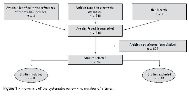 Of the 848 articles initially selected, a total of 822 were excluded, since they did not involve the group or intervention of interest. Therefore, twenty-six studies were subjected to the inclusion and exclusion criteria previously defined, after which only eight remained. Table 1 shows the principal characteristics of the articles included.