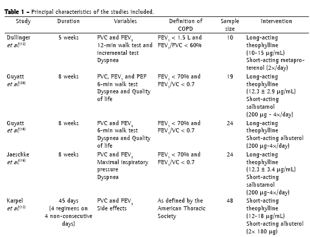 The present study was approved by the Ethics Committee of the Federal University of São Paulo/Paulista School of Medicine (process no. 251/00). The randomized clinical trials included were those in which theophylline was used in combination with ß2-agonists in stable patients with COPD. The exclusion criteria were as follows: studies with allocation concealment, inadequately described studies, studies of mixed populations (asthma and COPD patients), and studies of interventions other than those under study. Two independent reviewers evaluated the titles, abstracts, and methods sections of all identified reports of clinical trials. The studies that seemed to fulfill the inclusion criteria were selected. Subsequently, we built a collection of studies to be evaluated by the reviewers. The sources of study were as follows: the Excerpta Medica database, the Latin American and Caribbean Health Sciences Literature database, the Cochrane Controlled Clinical Trials Register, the Cochrane Airways Group Register of Randomized Controlled Trials, and the reference lists of the randomized clinical trials included.