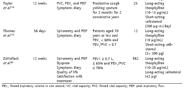 It is difficult to compare the results of various studies of the use of bronchodilators in the treatment of COPD, since there are methodological differences among such studies in terms of selection criteria, sample size, drug doses, methods of drug administration, and response evaluation criteria.(10)