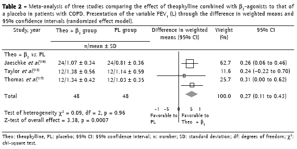 The last study included,(17) which contributed to the significant improvement in FEV1 in this meta-analysis, analyzed 12 stable patients with COPD (FEV1 = 1.09 ± 0.35 L) and bronchodilator reversibility of FEV1 = 15%. The duration of the study was 56 days, divided into four two-week phases. The interventions were as follows: theophylline; salbutamol; theophylline + salbutamol; and placebo. Spirometry was performed at the end of each phase. In the patients treated with the drugs, FEV1 improved by 13.5% in those receiving theophylline, 16.2% in those receiving salbutamol, and 31.3% in those receiving the two drugs in combination.. Therefore, use of the theophylline + salbutamol combination resulted in a significant improvement.