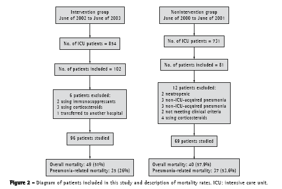 Intervention groupJune of 2002 to June of 2003No. of ICU patients = 854No. of patients included = 1026 patients excluded: 2 using immunosuppressants3 using corticosteroids1 transferred to another hospital96 patients studiedOverall mortality: 49 (51%)Pneumonia-related mortality: 25 (26%)Nonintervention groupJune of 2000 to June of 2001No. of ICU patients = 731No. of patients included = 8112 patients excluded:2 neutropenic 3 non-ICU-acquired pneumonia 3 non-ICU-acquired pneumonia 2 not meeting clinical criteria 4 using corticosteroids69 patients studiedOverall mortality: 40 (57.9%) Pneumonia-related mortality: 37 (53.6%). In the intervention period, 47 patients (49%) were discharged from the hospital (Table 3).