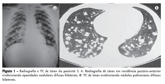 Comparando os três casos aqui relatados com os demais da literatura, observamos basicamente o mesmo padrão de manifestações pulmonares: pneumonia difusa,(12) com gravidades diferentes, e um paciente apresentando concomitante disseminação cutânea, que é a forma extratorácica mais comum.(18) Os achados radiológicos foram semelhantes, tanto na radiografia de tórax como na TC. Alguns métodos invasivos para o diagnóstico foram descritos na literatura, como a biópsia pulmonar(6) e a lobectomia,(5) o que não foi necessário no caso de nossos pacientes, pois o quadro clínico, os exames de imagem e a sorologia foram suficientes para a sua confirmação.