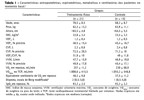 Os pacientes que finalizaram o estudo concluíram as 18 sessões de intervenção fisioterapêutica, resultando em grupos homogêneos quanto aos dados antropométricos e de função pulmonar (Tabela 1). Além disso, também se mostraram semelhantes quanto aos valores basais de VVM, VO2, VE, demanda ventilatória, demanda metabólica, equivalente ventilatório de dióxido de carbono, grau de dispneia e SpO2 (Tabela 1).
