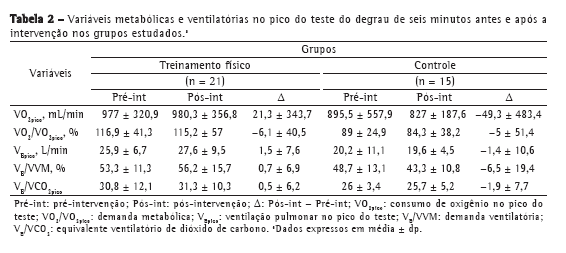 A Tabela 2 demonstra os resultados pré e pós-intervenção, podendo-se observar que não houve diferenças significativas para ambos os grupos em relação às variáveis VO2, VO2/VO2pico, VE, VE/VVM e VE/VCO2pico. Ao comparar os grupos quanto às mesmas variáveis citadas, também não houve diferenças significativas entre os mesmos.